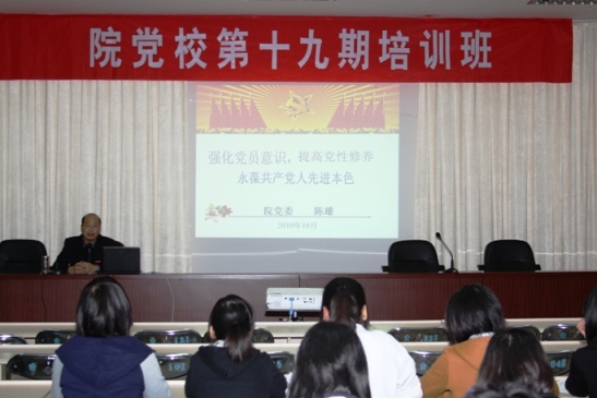 11月16日晚,在行政樓六樓會議室,院黨委陳雄副書記以《強化黨員意識,提高黨性修養,永葆共產黨人先進本色》為題為第19期黨校預備黨員培訓A班的學員們上了精彩的一課。陳雄副書記結合自己的學習經歷,利用生動活潑的課件形式,從強化黨員意識,牢記黨的宗旨和提高黨性修養,塑造堅強黨性兩個方面進行闡述,他聯系實際,語言生動,黨課內容發人深省、催人奮進。此次黨課在熱烈的掌聲中結束,課后,學員們紛紛表示陳副書記精彩的講解不僅提高了自己對黨、對社會、對國家的認識,也為自己今后的學習、生活、工作等方面起了指導作用,可謂受益匪淺。(黨委工作部)