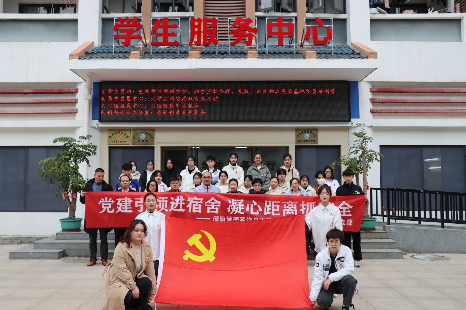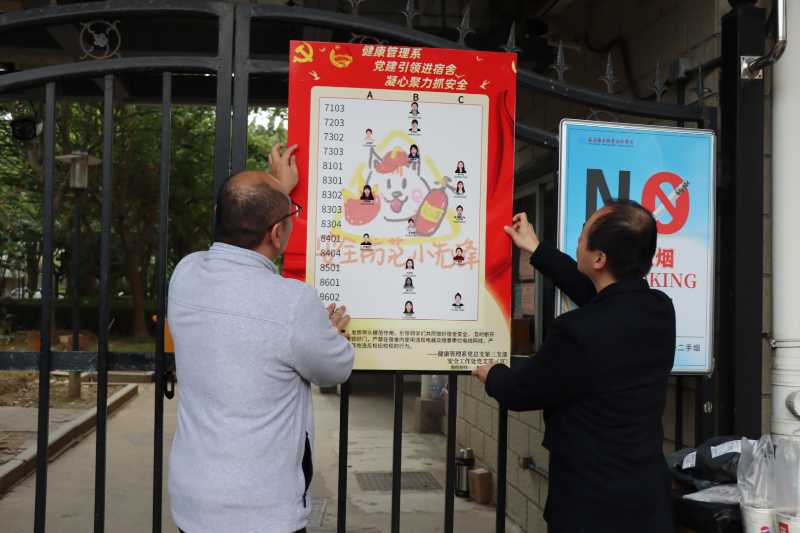 兩支部設立了由25個學生黨員和入黨積極分子任職的 “安全防范先鋒崗”,覆蓋健康管理系各年級宿舍,旨在通過安全小先鋒們的自我行為規范、定期安全主題宣傳、深入宿舍教育,引導其他同學以實際行動打造安全、文明、衛生的宿舍生活環境,樹立標桿形象,以點帶面,以新擔當、新作為奮進新時代。