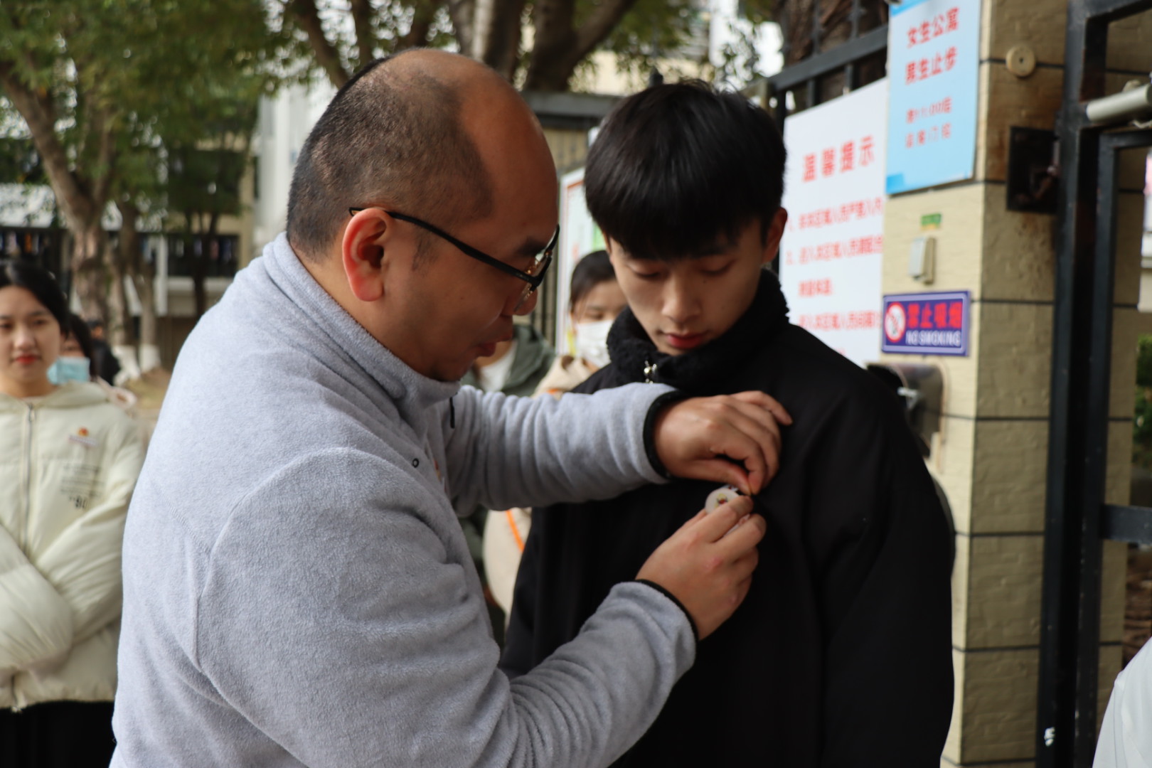 掛牌佩徽章 樹先鋒模范。雙方支部黨員代表為學生入黨積極分子和預備黨員宿舍掛牌,并為學生入黨積極分子和預備黨員佩戴徽章,鼓勵全體學生黨員、入黨積極分子爭做宿舍文明的踐行者、優良學風的先行者、和諧氛圍的調劑者、安全生活的守護者。