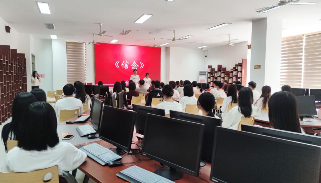 “這是一聲砸向舊世界的錘頭撞擊,合著十月革命驚天霹靂!”圖書館二樓電子閱覽室里傳出了慷慨激昂的青春呼聲,學生朗誦《信念》,拉開了主題黨日活動的序幕。同學們聲情并茂的演繹,向師生黨員們講述著中國共產黨人征途漫漫的信仰之旅,將不同時期的中國故事通過朗誦傳遞給每位師生黨員,激發師生黨員們的民族自豪感和自信心。