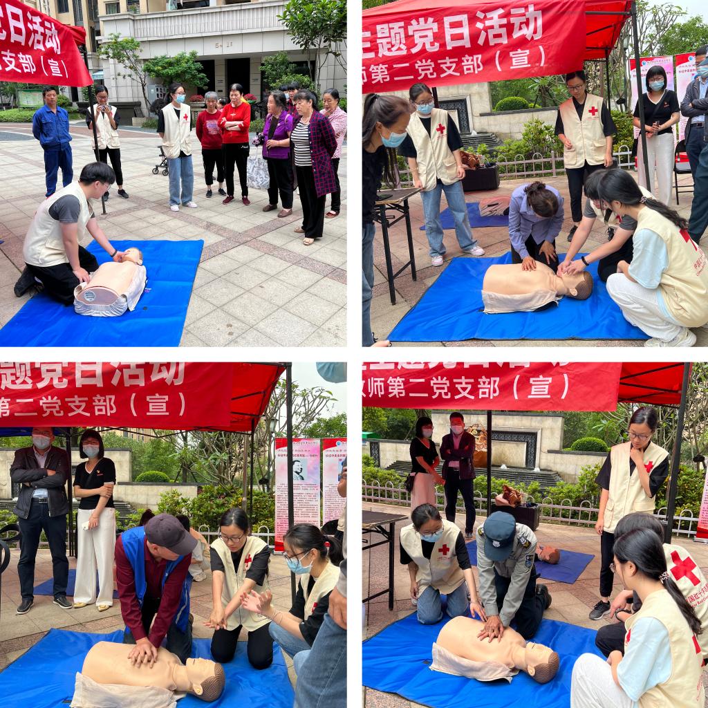 在醫學院教師第二黨支部黨員教師的指導下,醫學院紅十字會的同學們還開展了急救知識宣傳和現場心肺復蘇術技能培訓,吸引了保安師傅、物業大姐、社區居民、青少年等各類人群前來參與。