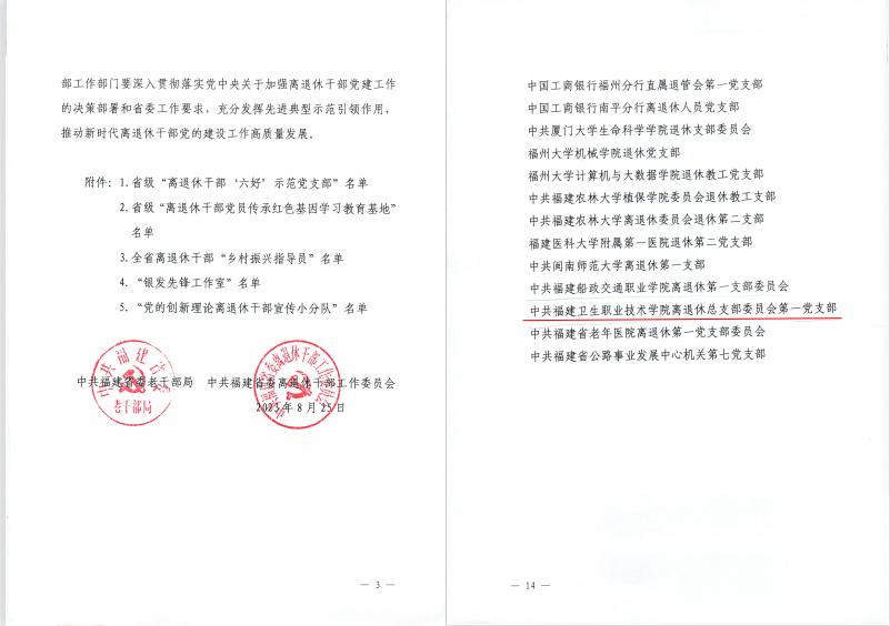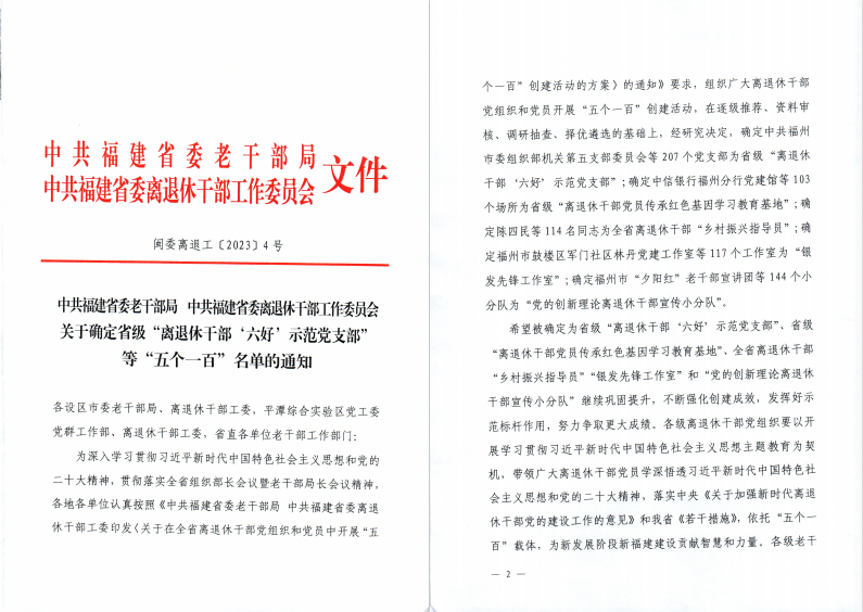 日前,中共福建省委老干部局、中共福建省委離退休干部工作委員會公布了2023年省級“離退休干部‘六好’示范黨支部”等“五個一百”名單,我校離退休黨總支第一黨支部首次被確定為省級“離退休干部‘六好’示范黨支部”,推動學校離退休干部黨建工作邁上新臺階。