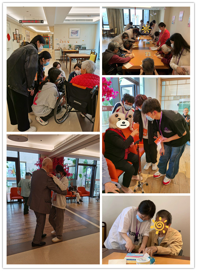 結束交流后,同學們在泰康之家工作人員的帶領下,分組進入園區的護理公寓,在園區護理師團隊老師的指導下,一同參與到在園區生活的長者們的文體活動中,與長者們一起完成一個小游戲、一幅畫、一首舞曲,并送上對長者們的祝福。