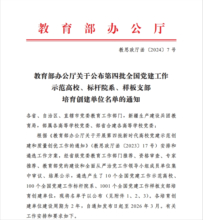 近日,教育部辦公廳公布第四批全國黨建工作示范高校、標桿院系、樣板支部培育創建單位名單,經省級黨委教育工作部門推薦、資格審查、專家推薦、教育部黨的建設和全面從嚴治黨工作領導小組成員單位集中審議、結果公示,遴選產生了10個全國黨建工作示范高校、100 個全國黨建工作標桿院系、1001個全國黨建工作樣板支部培育創建單位。