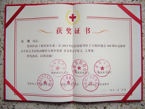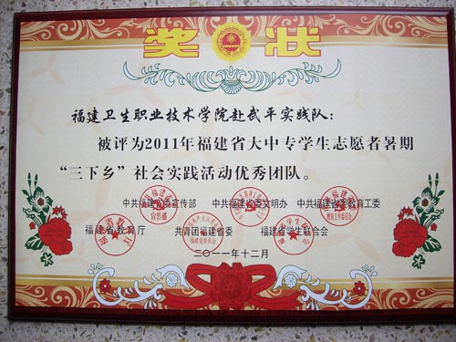 日前,我院被省委宣傳部、省文明辦、省教育工委、省教育廳、團省委、省學聯評為2011年福建省大中專學生志愿者暑期“三下鄉”社會實踐活動先進單位。我院赴武平實踐隊被評為2011年福建省大中專學生志愿者暑期“三下鄉”社會實踐活動優秀團隊。 團委宋維老師在省紅十字會、省教育廳、省文化廳、省文聯、福建日報集團、福建省廣播影視集團聯合組織的“紀念福建省紅十字組織建會100周年文學征文繪畫書法攝影作品大賽”中,獲得社會類文學征文三等獎。(院團委)