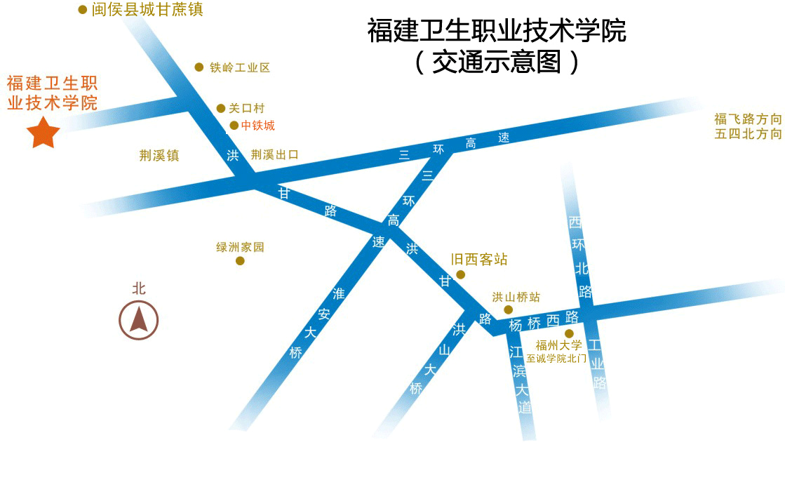 1.從市區(qū)內(nèi)可乘公交車至洪山橋車站,轉(zhuǎn)乘33、38公交車、38路區(qū)間車或福州至甘蔗巴士,到福建衛(wèi)生職業(yè)技術(shù)學(xué)院站下車。