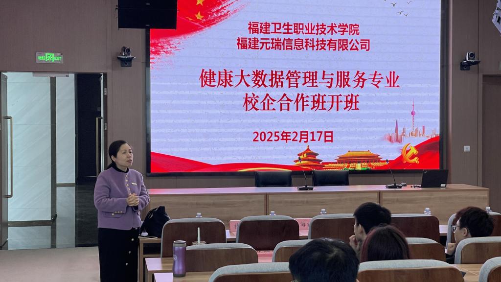 2月17日,我校第一屆健康大數(shù)據(jù)管理與服務(wù)專業(yè)“校企合作班”開(kāi)班儀式在國(guó)家東南健康醫(yī)療大數(shù)據(jù)中心隆重舉行。福建元瑞信息科技有限公司總經(jīng)理陳偉林、常務(wù)副總徐錦元、副總經(jīng)理李昱、各部門負(fù)責(zé)人,學(xué)校黨委副書(shū)記李美華,健康學(xué)院領(lǐng)導(dǎo)班子成員、健康大數(shù)據(jù)教研室專任教師、輔導(dǎo)員以及23級(jí)健康大數(shù)據(jù)管理與服務(wù)301班的學(xué)生共同參加開(kāi)班儀式。