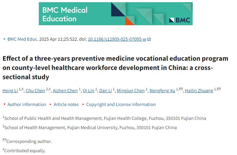 近日,我校教師在國際知名教育類學(xué)術(shù)期刊《BMC Medical Education》(JCR中科院3區(qū))上發(fā)表題為“Effect of a three-years preventive medicine vocational education program on county-level healthcare workforce development in China: a cross-sectional study”的研究文章。我校教師李宏為第一作者,許能鋒、莊海林為共同通訊作者。