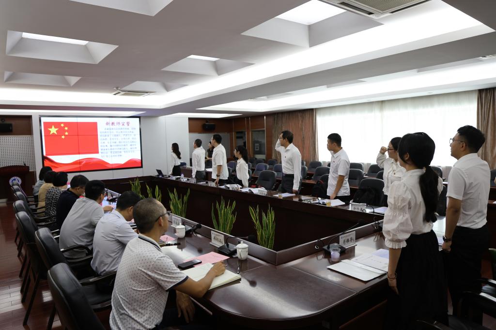 在領誓人的帶領下,新教師們舉起右手,莊嚴宣誓。鏗鏘有力的誓言回蕩在會場,不僅是對教育事業的鄭重承諾,更是對自身責任與使命的深刻銘記。這一刻,他們正式以“教師”之名,肩負起立德樹人的神圣職責。