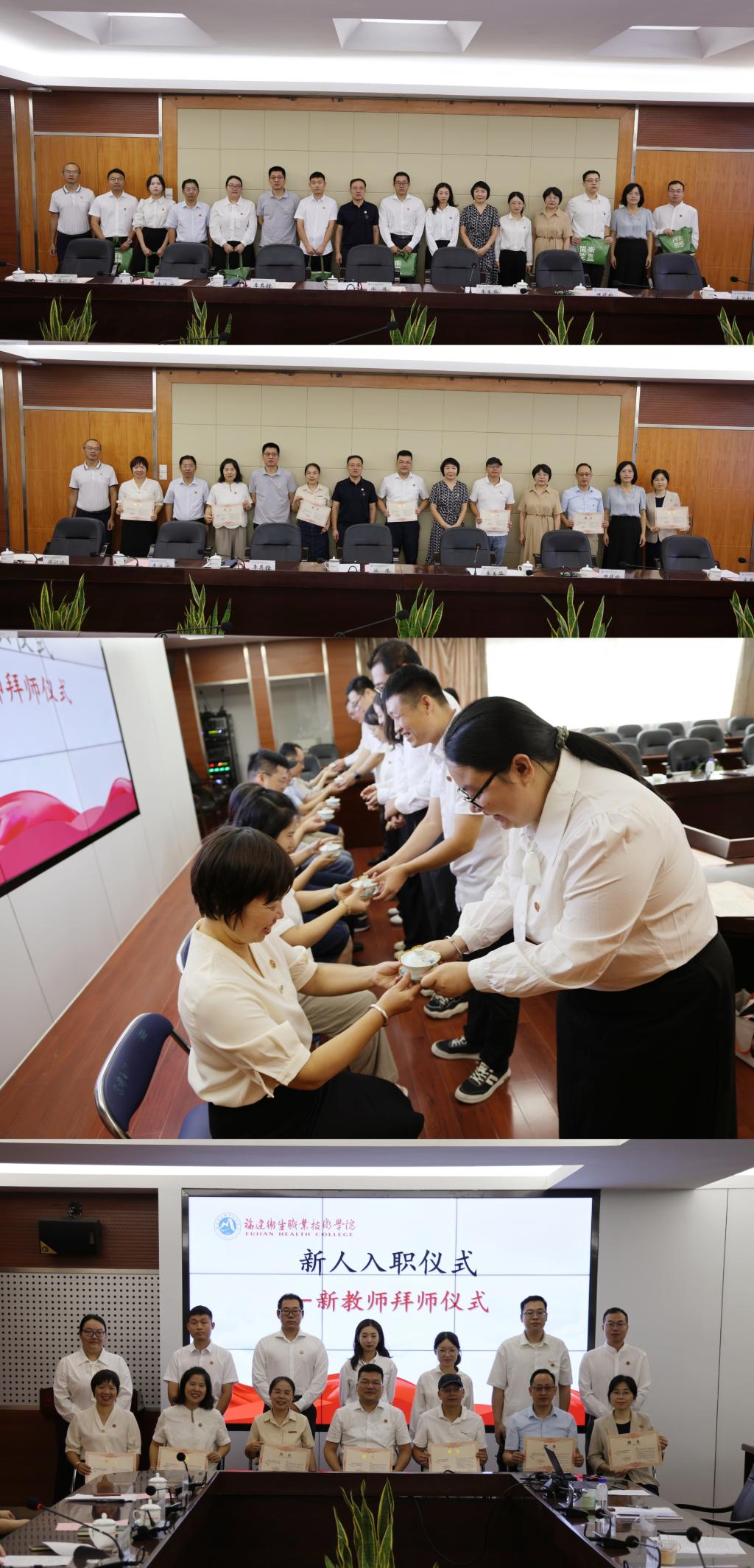 校領導及相關職能部門負責人共同為新教師佩戴校徽,發放了入職禮包,并為新教師導師頒發聘書,共同見證“師徒結對”的莊嚴一刻。