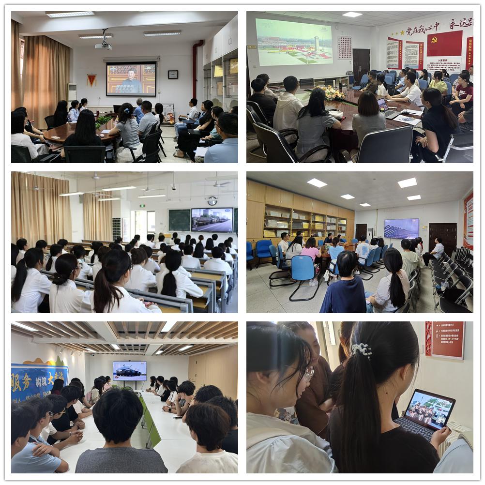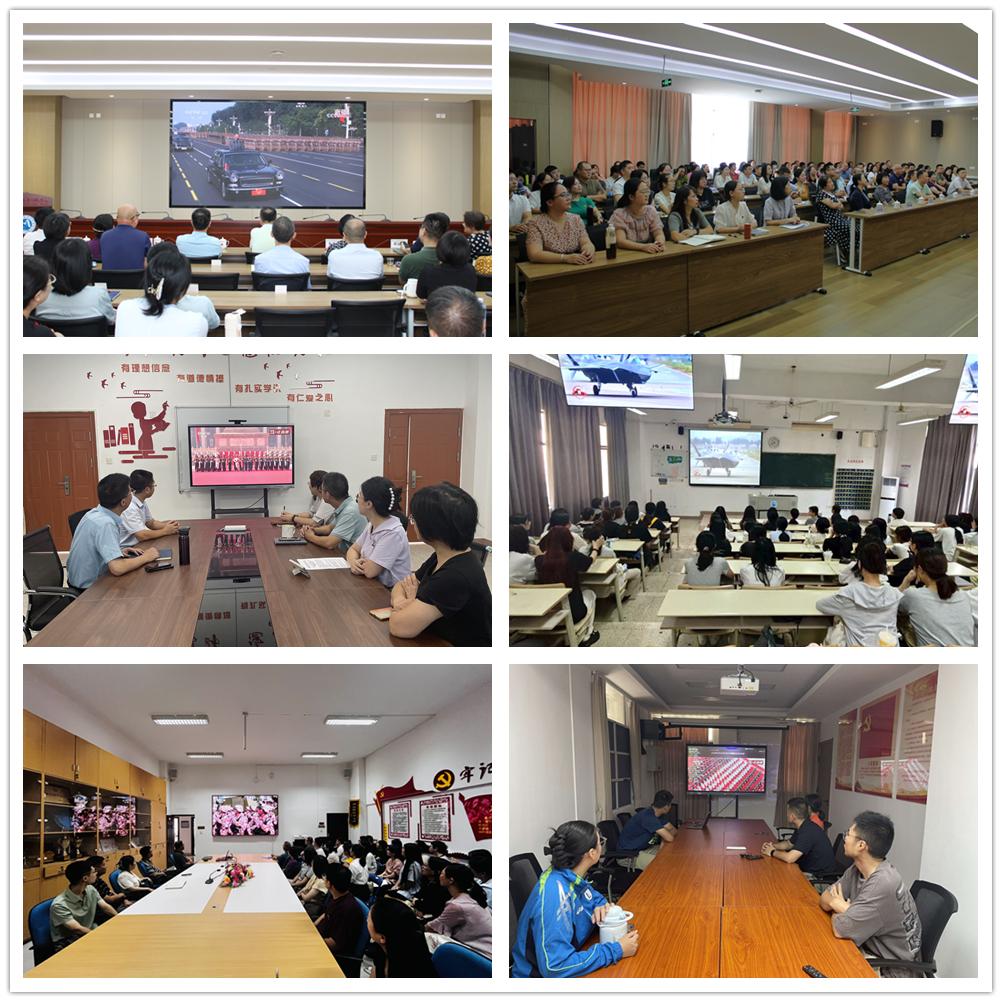 上午9時,大會正式開始,當莊嚴的國歌響徹屏幕,在場觀看的師生眼神中充滿著對勝利的致敬和對祖國的赤誠。在會議室、教室等觀看點,師生們坐姿端正、神情專注,目光緊緊追隨直播畫面。大家全神貫注、認真聆聽習近平總書記發表重要講話。習近平總書記的重要講話立意高遠、視野宏闊,特別是“中華民族偉大復興勢不可擋!人類和平與發展的崇高事業必將勝利!”的莊嚴宣告,令人無比振奮,倍增奮進力量。當畫面切換至威武的軍隊邁著整齊劃一的正步走向天安門廣場時,鏗鏘的步伐、昂揚的姿態瞬間點燃全場熱情,師生們內心激蕩起強烈的自豪感;一系列“國之重器”的非凡風采,讓在場師生深刻感受到國家國防實力的日益強大;而當抗戰老兵代表受邀出席的身影出現在鏡頭中,師生們紛紛動容。大家在光影交織中重溫崢嶸歲月,更深刻體會到如今和平生活的來之不易,也更加堅定了珍惜當下、報效祖國的信念。