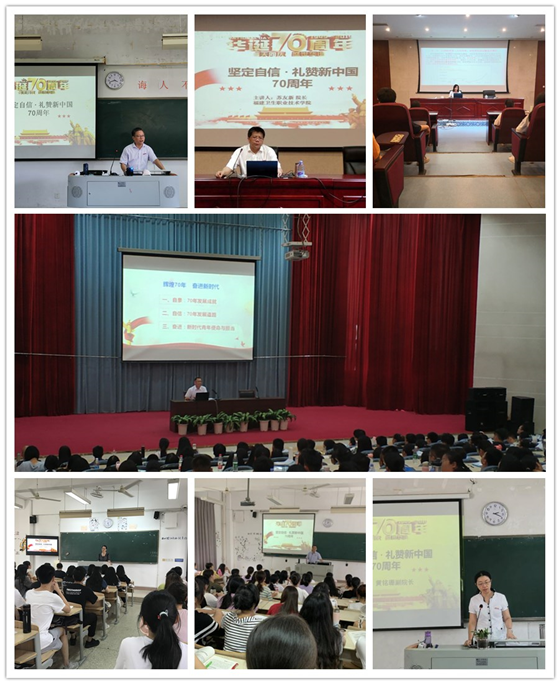 9月5日至12日,福建衛職院黨委書記曾武祈、院長蘇友新、副書記李美華、紀委書記游峰、副院長陳貞健、黃銘珊和鄭翠紅等校領導紛紛走上講臺,為全校各系新老生講授以《堅定自信·禮贊中華人民共和國成立70周年》為主題的形勢與政策開學第一課。