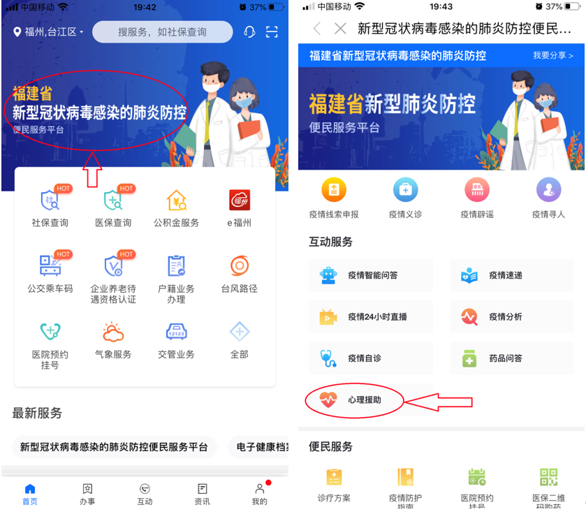 公眾可下載閩政通APP,點擊頭部“福建省新型冠狀病毒感染的肺炎防控”,進入專題,點擊互動服務欄目中的“心理援助”,就可進入心理援助平臺,進行電話咨詢或網絡咨詢,工作時間均為每天9:00~22:00。