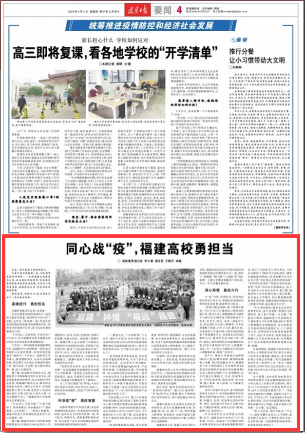 這是一場只能贏不能輸?shù)膽?zhàn)斗。 從醫(yī)療救治到馳援一線,從檢測研發(fā)到科學(xué)預(yù)防……自新冠肺炎疫情發(fā)生以來,我省高校積極投身、統(tǒng)籌推進(jìn)疫情防控和經(jīng)濟(jì)社會發(fā)展,與全省人民同舟共濟(jì),揚(yáng)起命運(yùn)與共、共克時(shí)艱的精神風(fēng)帆。 面對疫情,迎難而上!我省高校交出了一份出色的答卷! 英雄逆行 高校擔(dān)當(dāng) 關(guān)鍵時(shí)刻挺身而出的,是英雄。 在這次教育系統(tǒng)防疫戰(zhàn)役中,高校的力量舉足輕重,高校師生不僅守好了校園,還沖在了防疫第一線。我省多家高校附屬醫(yī)院積極參加援鄂醫(yī)療隊(duì)、承擔(dān)省內(nèi)防疫醫(yī)療任務(wù),成為抗擊疫情的重要生力軍! “不忘初心,完成使命,平安歸來!”3月24日,作為福建省首批支援湖北醫(yī)療隊(duì)隊(duì)員歸來的林忠厚感慨地說。 大年初二,得知福建省組建援鄂醫(yī)療隊(duì),福建醫(yī)科大學(xué)附屬第一醫(yī)院急診科副護(hù)士長林忠厚第一時(shí)間向院黨委遞交“請戰(zhàn)書”。大年初三,他辭別父母和妻兒,隨團(tuán)馳援武漢。在武漢金銀潭醫(yī)院,林忠厚作為小組長負(fù)責(zé)綜四病區(qū)工作。他不怕苦、不怕累,每天都沖鋒在第一線、戰(zhàn)斗在最前沿。 據(jù)了解,新冠肺炎疫情發(fā)生后,福建醫(yī)科大學(xué)積極響應(yīng)黨中央的號召,按照省委省政府的要求,充分發(fā)揮學(xué)科專業(yè)優(yōu)勢,積極履行服務(wù)社會、服務(wù)師生的使命與擔(dān)當(dāng)?!敖刂?月28日,學(xué)校附屬醫(yī)院已累計(jì)有385名醫(yī)護(hù)人員前往湖北進(jìn)行支援,他們舍小家為大家,義無反顧逆行而上?!备=ㄡt(yī)科大學(xué)黨委副書記黃愛民說。 “專業(yè)對口,無怨無悔。”“大家不要爭了,我身體最壯,我去最適合!”“國家需要,義不容辭!”……接到上級通知,福建中醫(yī)藥大學(xué)附屬醫(yī)院的醫(yī)護(hù)人員主動請戰(zhàn)一線。 據(jù)了解,福建中醫(yī)藥大學(xué)四家直屬附屬醫(yī)院共分批派出102名醫(yī)護(hù)人員增援武漢、宜昌,弘揚(yáng)大醫(yī)精神、貢獻(xiàn)中醫(yī)智慧,在湖北抗疫一線發(fā)揮了重要作用?!案=ㄖ嗅t(yī)人充分發(fā)揮了中醫(yī)藥在疫情防控方面的特色優(yōu)勢,并取得了良好的療效,得到了兄弟省份和同行的廣泛好評。此外,學(xué)校還充分發(fā)揮專家作用,通過遠(yuǎn)程會診等形式,為戰(zhàn)勝疫情獻(xiàn)策獻(xiàn)力?!备=ㄖ嗅t(yī)藥大學(xué)校長李燦東教授告訴記者。 “我曾在武漢求學(xué),此去更加義無反顧?!边@是福建省首批馳援武漢的廈門大學(xué)附屬第一醫(yī)院醫(yī)生趙貫金出征前的誓言,他說,支援武漢的消息一經(jīng)傳出,他就毫不猶豫地寫下了請戰(zhàn)書。 從三尺講臺到戰(zhàn)“疫”陣地,從各自崗位到武漢前線,師生校友化身戰(zhàn)士,高校學(xué)府皆成砥柱,筑起了守護(hù)生命的白衣長城。 科學(xué)戰(zhàn)“疫” 高校智慧 戰(zhàn)勝疫情離不開科技支撐。在這場疫情防控阻擊戰(zhàn)中,我省高校沖在疫情防控、臨床診治、科學(xué)研究的第一線,勇于擔(dān)當(dāng)、積極作為,取得重要階段性成果,充分體現(xiàn)了近年來我省推進(jìn)高??萍俭w制機(jī)制改革創(chuàng)新的成效。 “一滴指尖血,十分鐘檢測。”3月10日,福州大學(xué)宣布,該校與廈門寶太生物科技有限公司合作研發(fā)的新冠病毒檢測試劑盒獲歐盟CE準(zhǔn)入,將正式投放歐洲市場,月產(chǎn)能可達(dá)300萬人份以上! “該試劑盒采用膠體金法,具有很高的靈敏度和特異性,可用于體外定性檢測血漿、全血樣本中的SARS-CoV-2冠狀病毒IgG/IgM抗體。產(chǎn)品即采即測,無需輔助儀器,可肉眼判斷,10分鐘即可得出檢測結(jié)果?!备V荽髮W(xué)食品安全與生物分析教育部重點(diǎn)實(shí)驗(yàn)室、福建省健康智能診斷技術(shù)工程研究中心林振宇教授表示。目前試劑盒已在福建三家定點(diǎn)醫(yī)院經(jīng)過初步臨床驗(yàn)證,“下一步,我們的目標(biāo)是產(chǎn)品能在國內(nèi)市場上市”。 無獨(dú)有偶,3月6日,廈門大學(xué)國家傳染病診斷試劑與疫苗工程技術(shù)研究中心夏寧邵團(tuán)隊(duì)等聯(lián)合研制的新型冠狀病毒(2019-nCoV)抗體檢測試劑盒,也正式獲準(zhǔn)上市并已完成產(chǎn)業(yè)化,月產(chǎn)能超100萬人份。據(jù)了解,這也是國內(nèi)外首個(gè)獲批的雙抗原夾心法總抗體檢測試劑。 “新冠病毒檢測試劑盒,具有靈敏度高、特異性好、隨到隨檢、全自動高通量、29分鐘出結(jié)果等優(yōu)點(diǎn),結(jié)合核酸檢測,可用于臨床病例和疑似病例的檢測以及特殊高危人群的篩查,大大提高了一線醫(yī)療機(jī)構(gòu)的檢測效率。”廈門大學(xué)相關(guān)研究人員表示。 早預(yù)防,是打贏疫情防控阻擊戰(zhàn)的關(guān)鍵之一。面對疫情,我省各高校綜合運(yùn)用多種手段,加強(qiáng)對新冠肺炎的預(yù)防。 福建高校網(wǎng)上紅色書屋推出疫情防控專欄,上架《新型冠狀病毒肺炎預(yù)防手冊》《新型肺炎權(quán)威解讀》等67本疫情防護(hù)相關(guān)圖書,普及疫情防控專業(yè)知識,得到學(xué)生的追捧。 閩江學(xué)院、莆田學(xué)院等高校創(chuàng)立“防疫知識驛站”,建立《以愛防疫,“易”起同行》公開課群,集中開展防疫