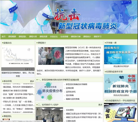 近日,一門(mén)緊扣當(dāng)下疫情防控的網(wǎng)絡(luò)課程《抗擊新型冠狀病毒肺炎——新型冠狀病毒的個(gè)人防護(hù)與學(xué)校衛(wèi)生》現(xiàn)身“天使之城”學(xué)習(xí)平臺(tái),供福建衛(wèi)生職業(yè)技術(shù)學(xué)院學(xué)生在線(xiàn)學(xué)習(xí)。這門(mén)課程是學(xué)院管理系教師聯(lián)合預(yù)防醫(yī)學(xué)教研室,利用預(yù)防醫(yī)學(xué)專(zhuān)業(yè)優(yōu)勢(shì)開(kāi)發(fā)而成。