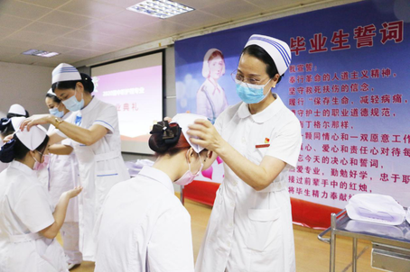 ▲扶貧班畢業(yè)典禮上,護理前輩為畢業(yè)生授帽、傳光