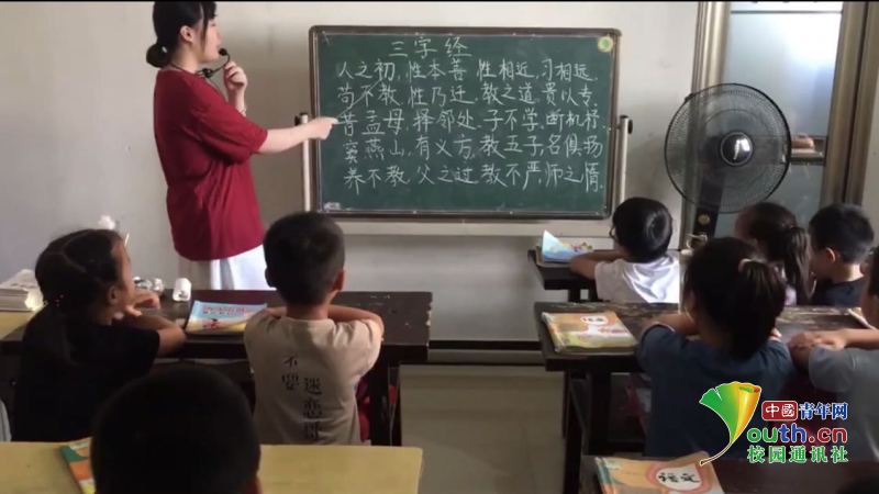 圖為志愿者在家鄉(xiāng)小學(xué)宣傳《三字經(jīng)》知識(shí),講解《三字經(jīng)》中的故事典故,帶領(lǐng)小朋友們一起朗讀。中國青年網(wǎng)通訊員 蔡小華 供