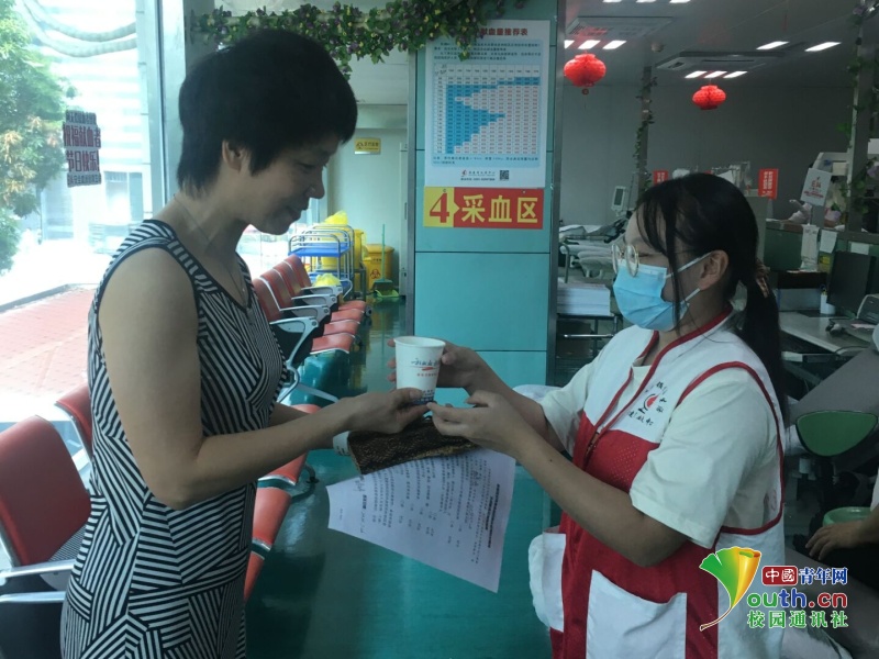 ?????實踐團血站志愿者小分隊為前來獻血的志愿者端上葡萄糖水,介紹獻血的相關注意事項,幫助填寫表格,科普獻血的好處。