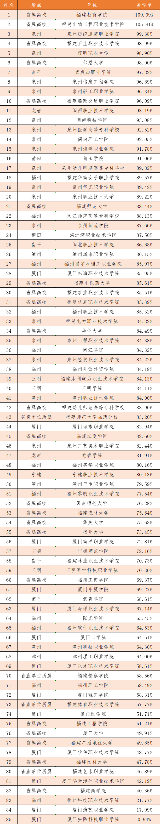 第九季第十三期“青年大學(xué)習(xí)”網(wǎng)上主題團(tuán)課,高校團(tuán)委中共有49所學(xué)校參學(xué)率達(dá)到80%,對(duì)以下各高校的團(tuán)組織提出表揚(yáng):福建教育學(xué)院本周109.09%參學(xué)率獲得第一名,參學(xué)率最高。福建生物工程職業(yè)學(xué)院獲得第二名。排名第三至第五名分別泉州紡織服裝職業(yè)學(xué)院、福建衛(wèi)生職業(yè)技術(shù)學(xué)院、黎明職業(yè)大學(xué),排名第六名至第十名為仰恩大學(xué)、武夷山職業(yè)學(xué)院、泉州信息工程學(xué)院、泉州輕工職業(yè)學(xué)院、福建船政交通職業(yè)學(xué)院。