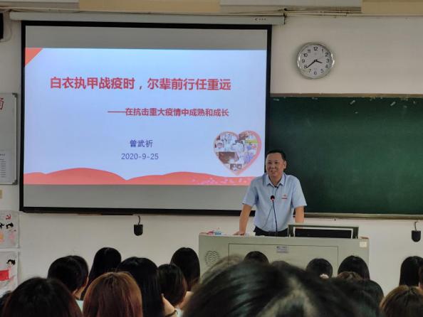 9月,福建衛(wèi)生職業(yè)技術(shù)學(xué)院黨委書(shū)記曾武祈、黨委副書(shū)記李美華、紀(jì)委書(shū)記游鋒、副院長(zhǎng)陳貞健、副院長(zhǎng)黃銘珊等院領(lǐng)導(dǎo)以“白衣執(zhí)甲戰(zhàn)疫時(shí),爾輩前行任重遠(yuǎn)”、“戰(zhàn)‘疫',我們?cè)谝黄穑 睘橹黝}紛紛走上講臺(tái),以學(xué)生喜聞樂(lè)見(jiàn)、愛(ài)聽(tīng)想聽(tīng)的內(nèi)容以及風(fēng)趣幽默、感人肺腑的語(yǔ)言,為大二學(xué)生上了一堂既生動(dòng)活潑又充滿正能量的開(kāi)學(xué)第一課,用抗疫精神滋養(yǎng)心靈,用英雄豐碑感召時(shí)代,在衛(wèi)院學(xué)子心中點(diǎn)亮一盞明燈,照亮征途、指引方向。