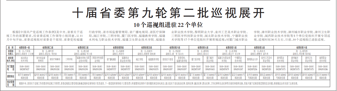 根據《中國共產黨巡視工作條例》及中央、省委關于巡視工作的部署要求,經省委巡視工作領導小組同意,從11月中旬開始,省委巡視組對省委老干部局、省委黨校福建行政學院、省市場監督管理局、省廣播電視局、省醫療保障局,閩江學院、三明學院、廈門醫學院、福建教育學院、福建水利電力職業技術學院、福建衛生職業技術學院、福建農業職業技術學院,黎明職業大學、泉州工藝美術職業學院、三明醫學科技職業學院、閩北職業技術學院、寧德職業技術學院等17個單位黨組織開展常規巡視;對廈門城市職業學院、漳州職業技術學院、漳州城市職業學院、漳州衛生職業學院、閩西職業技術學院等5個單位黨組織開展專項巡視。巡視時間30天左右。日前,10個巡視組已進駐巡視。