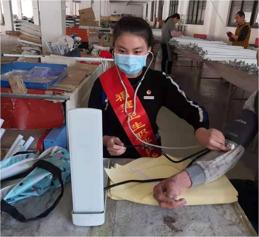 王慧參加志愿活動為工人們測量血壓。受訪者供圖