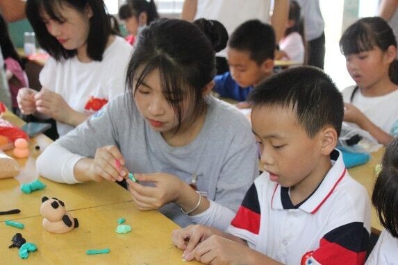 圖為紅色筑夢隊在梅營小學與小朋友們制作手工藝術品。中國青年網(wǎng)通訊員 黃佳麗 攝