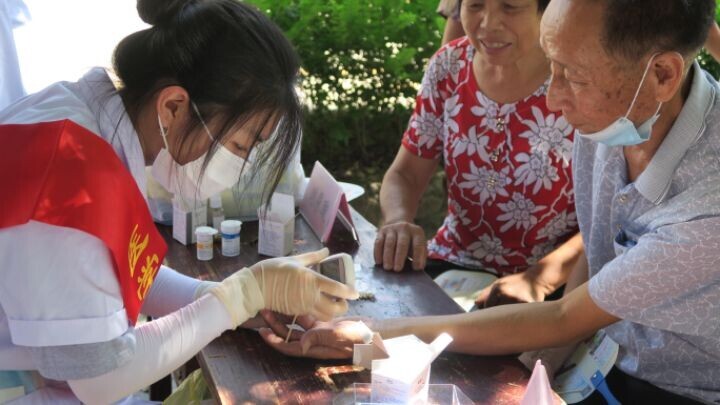 ?圖為志愿者為村民測量膽固醇。中國青年網通訊員 許偉杰 攝?