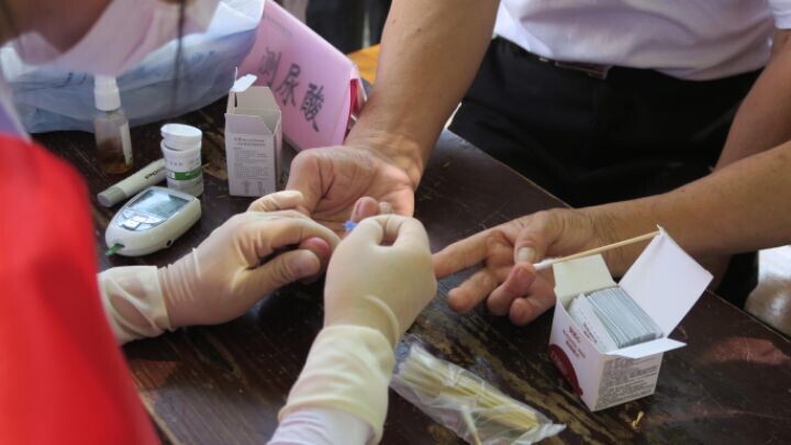 ?圖為志愿者為村民測量尿酸。中國青年網通訊員 方宇 攝?