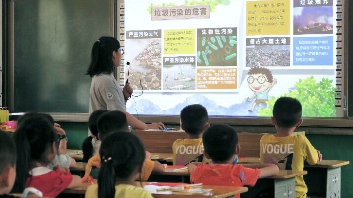 ?圖為紅色筑夢隊隊員對小朋友們進行垃圾分類知識宣講 中國青年網通訊員 黃佳麗 攝?