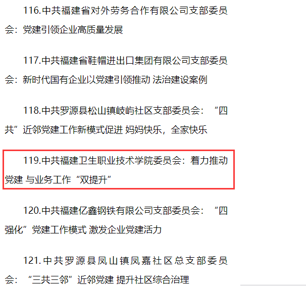 為宣傳貫徹落實習近平總書記在福建考察時的重要講話精神,人民網(wǎng)福建頻道聯(lián)合中共福建省委組織部、中共福建省委黨校、福建行政學院、中共福建省委教育工作委員會、中共福建省人民政府國有資產(chǎn)監(jiān)督管理委員會委員會、中國電信股份有限公司福建分公司,自2021年4月始,面向福建全省各領(lǐng)域基層黨組織,開展“福建省新時代黨建品牌、優(yōu)秀案例征集”活動。經(jīng)過第一輪篩選,選出案例共896個。現(xiàn)將初選名單予以公布。(按所在地分類)