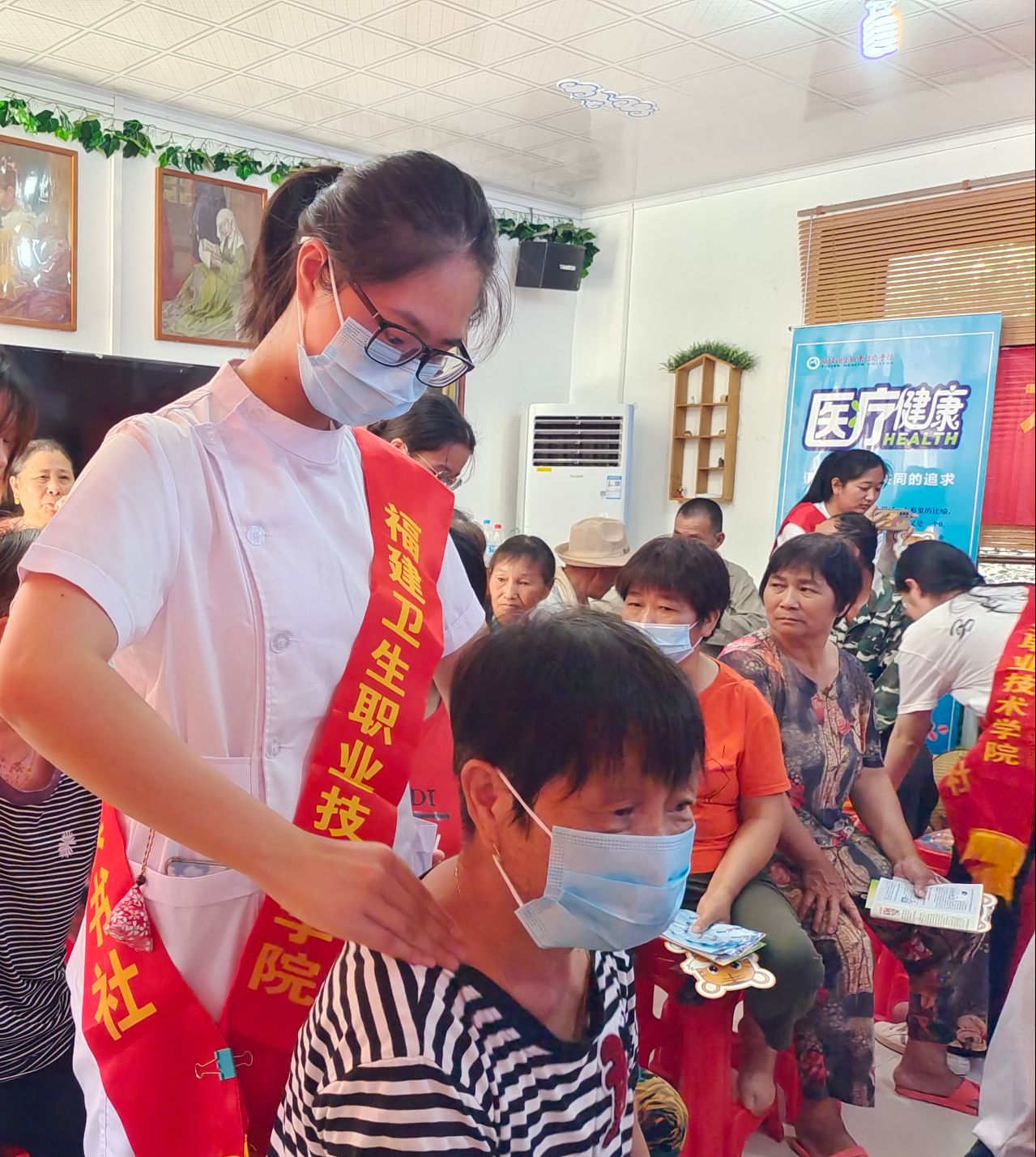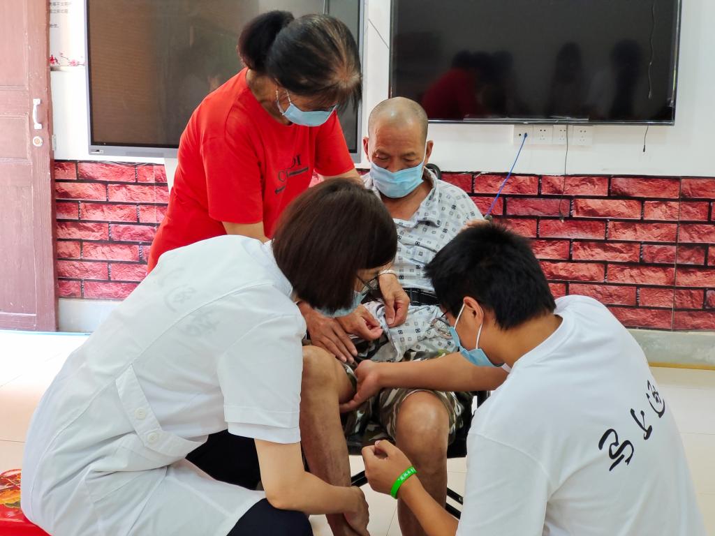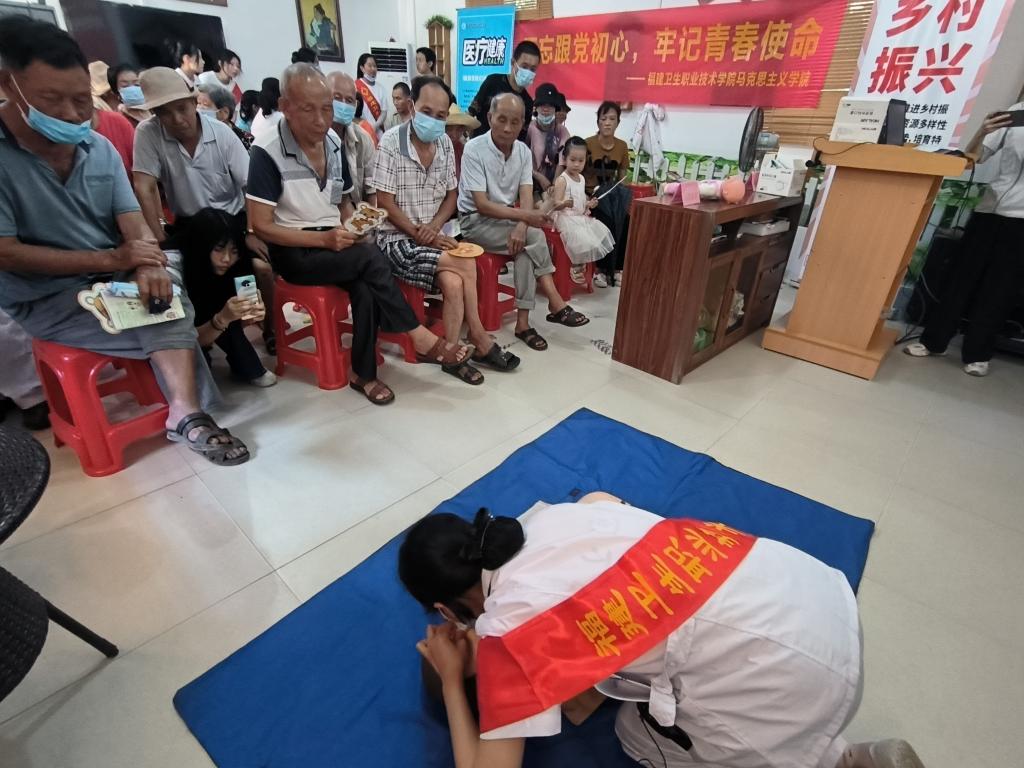 “思政+專業(yè)”是福建衛(wèi)職院思政實(shí)踐教學(xué)特色之一,在發(fā)揮專業(yè)所長(zhǎng)的社會(huì)實(shí)踐中進(jìn)行思政價(jià)值引領(lǐng),讓實(shí)踐教學(xué)“接地氣”,讓思政元素“自然流露”,讓思政育人“水到渠成”。“新時(shí)代醫(yī)學(xué)生如何助力健康中國(guó)戰(zhàn)略?”以此為切入點(diǎn),24位醫(yī)學(xué)生為村民提供醫(yī)學(xué)咨詢、中醫(yī)推拿、示范培訓(xùn)、血壓測(cè)量、專家義診等醫(yī)療服務(wù),對(duì)預(yù)防高血壓、糖尿病等慢性病、常見(jiàn)病進(jìn)行健康科普,在“我為群眾辦實(shí)事”中踐行醫(yī)者初心,體悟醫(yī)者使命?!拔覑?ài)人癱瘓臥床,他要是能來(lái)現(xiàn)場(chǎng)就好了!”活動(dòng)現(xiàn)場(chǎng)村民江本松的妻子感慨到。實(shí)踐隊(duì)了解情況后,從家里接來(lái)了江本松老人,在詳細(xì)了解病情之后,為其進(jìn)行肢體的被動(dòng)活動(dòng)和四肢牽伸,并細(xì)致提供康復(fù)保健建議。現(xiàn)場(chǎng)“插曲”成為了生動(dòng)鮮活的育人育才素材。通過(guò)愛(ài)心義診,隊(duì)員們深有感悟:所謂“醫(yī)者藝也,醫(yī)者仁也”,將醫(yī)學(xué)探究到極致,從而惠及眾生是我們作為未來(lái)醫(yī)者的畢生所求,我們應(yīng)精進(jìn)醫(yī)學(xué)技術(shù),不斷提升服務(wù)態(tài)度,為患者身體健康保駕護(hù)航,為祖國(guó)醫(yī)學(xué)事業(yè)的發(fā)展盡綿薄之力。