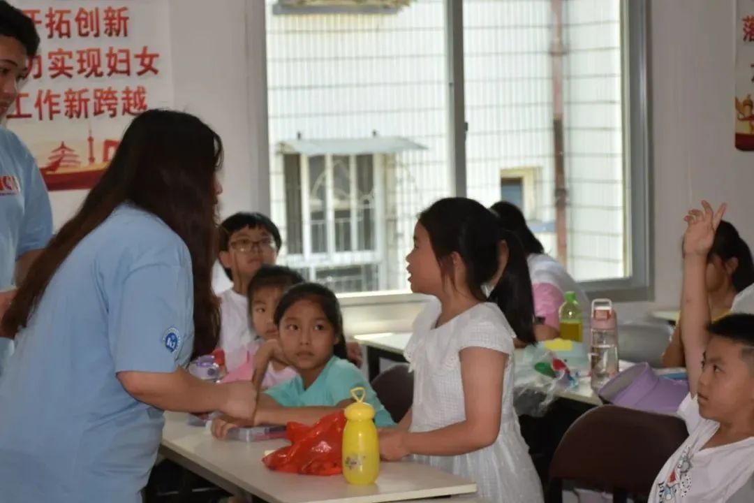 在社區夏令營,福建衛生職業技術學院學生向兒童普及艾滋病預防知識。