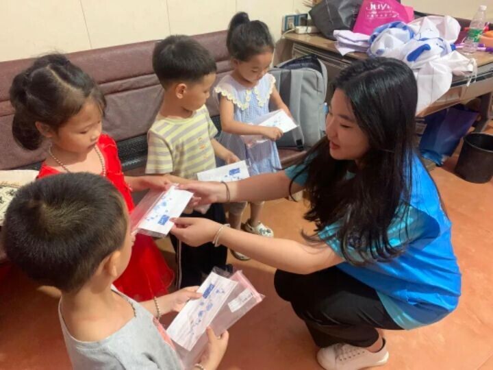 圖為志愿者給小朋友發放日常文具及口罩等。中國青年網通訊員 嚴靜怡 供圖