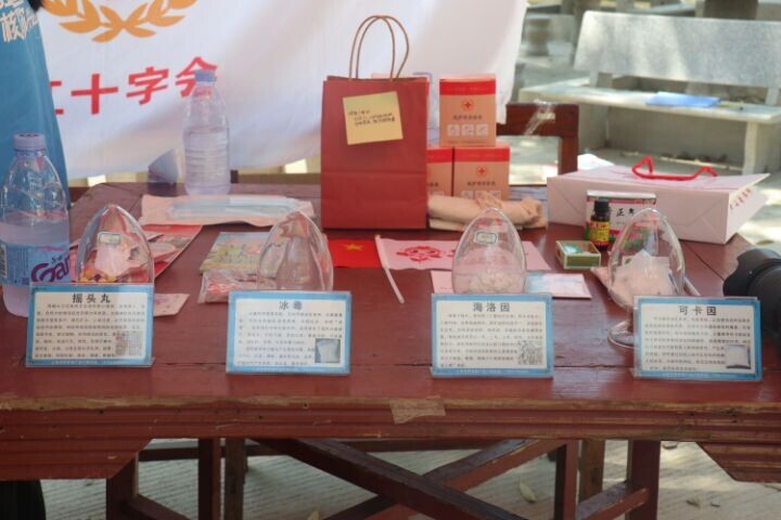圖為仿真毒品模型及為居民準備的藥品禮袋。中國青年網通訊員 嚴靜怡 供圖?