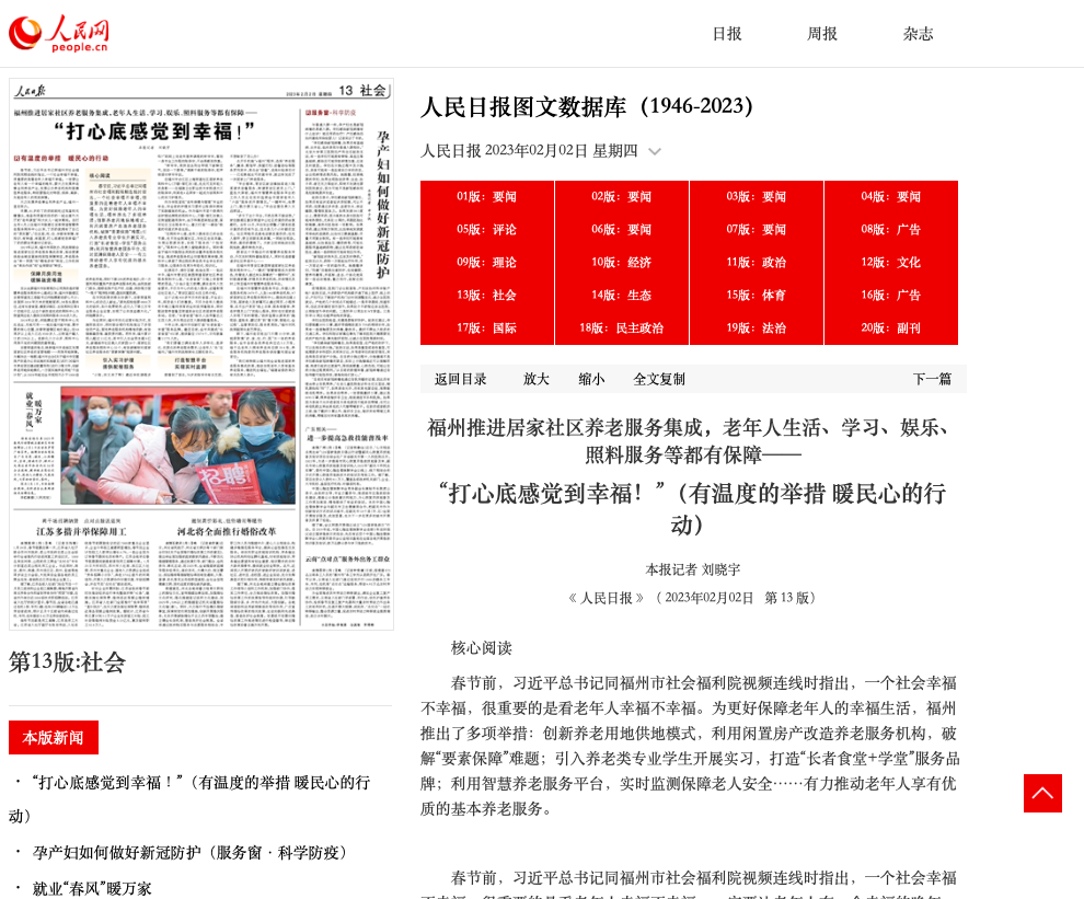 春節前,習近平總書記同福州市社會福利院視頻連線時指出,一個社會幸福不幸福,很重要的是看老年人幸福不幸福。為更好保障老年人的幸福生活,福州推出了多項舉措:創新養老用地供地模式,利用閑置房產改造養老服務機構,破解“要素保障”難題;引入養老類專業學生開展實習,打造“長者食堂+學堂”服務品牌;利用智慧養老服務平臺,實時監測保障老人安全……有力推動老年人享有優質的基本養老服務。