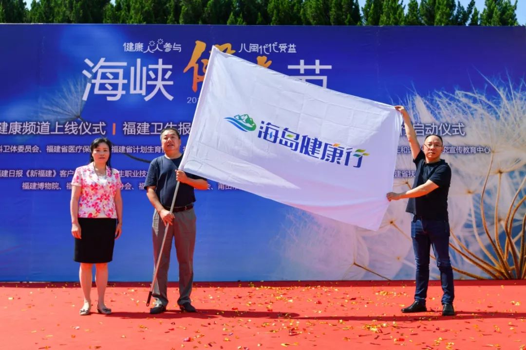 (莆田秀嶼區衛健局副局長陳國富(中)接過福建省計劃生育協會項目工作部張晨霞部長(左一)與每周文摘報社總編輯、福建衛生報總編輯陳冬青(右一)手中的旗幟,“海島健康行”公益品牌系列活動正式啟動 )