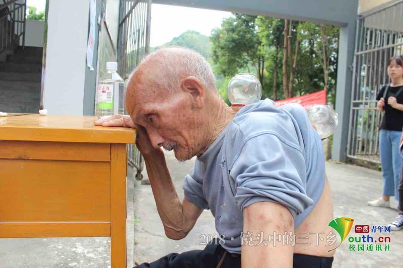 7月4日成員們在嶺腰村提供愛心醫療,老人因有脊椎病而行動不便,成員們為他提供了拔罐。中國青年網通訊員 吳雪兒 攝