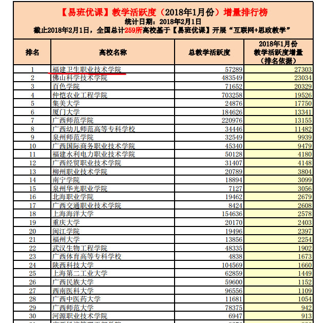 臨近春節,福建衛生職業技術學院易班網絡思政教育再傳喜訊,在2018年1月份全國易班優課平臺教學活躍度增量排行榜中,該校在全國259所高校共同參與的排名中位列第一。