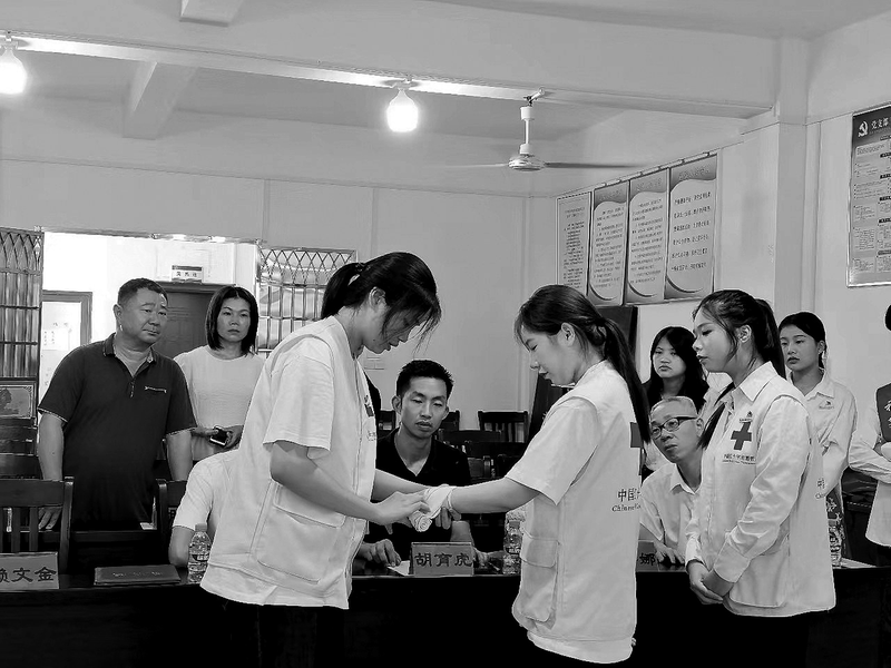圖為該校紅十字會學生為歸僑眷作心肺復蘇、海姆立克急救法和常見傷口繃帶包扎的演示講解。 (熊美蘭 羅蕓圖/文)
