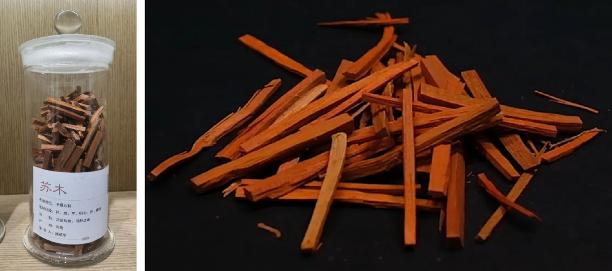 蘇木能活血祛瘀、消腫止痛,用于跌打損傷、骨折筋傷、瘀滯腫痛、經閉痛經、產后瘀阻、胸腹刺痛、癰疽腫痛,可與紅花配伍使用增強藥效。蘇木中心橫紋似紫角,古人稱其為“木中尊色”,炮制后形如紅柴,故又有“紅柴”之別稱。