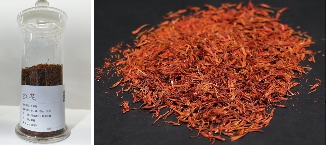 紅花可活血通經、散瘀止痛,尤擅治療血瘀引起的經閉痛經、胸痹心痛及跌撲損傷等,是臨床常用的婦科良藥。紅花可泡茶、燉湯,搭配艾草泡腳可暖身驅寒,古代還常用于胭脂的制作,兼具藥用與美學價值。