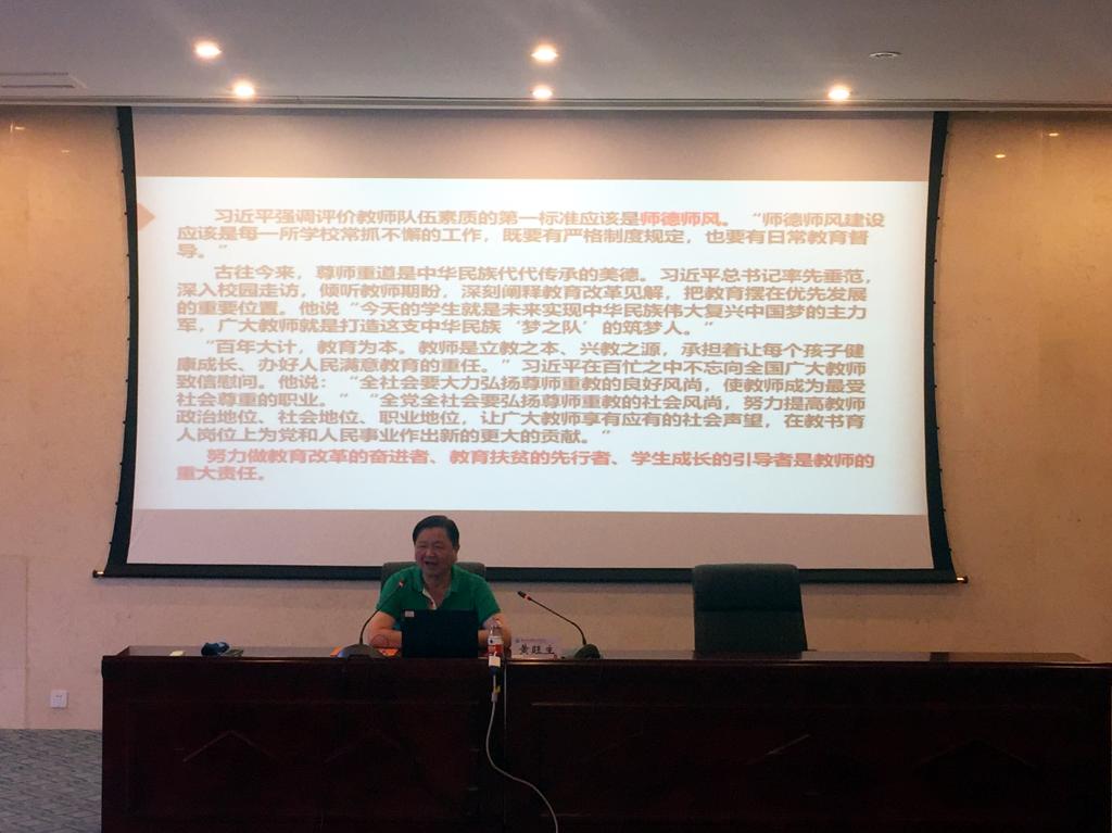 10月6日下午,黃旺生教授以《弘揚高尚師德,做一名人民滿意的高校教師》為題,通過活潑生動、睿智感人的教育事跡,娓娓道出了一名老教師對教師職業和師德修養的理解與感悟,分享了自身從教數十年的喜怒哀樂和酸甜苦辣,闡明了師德的重要性和基本要求,并勉勵青年教師要認真履行教書育人的神圣使命。