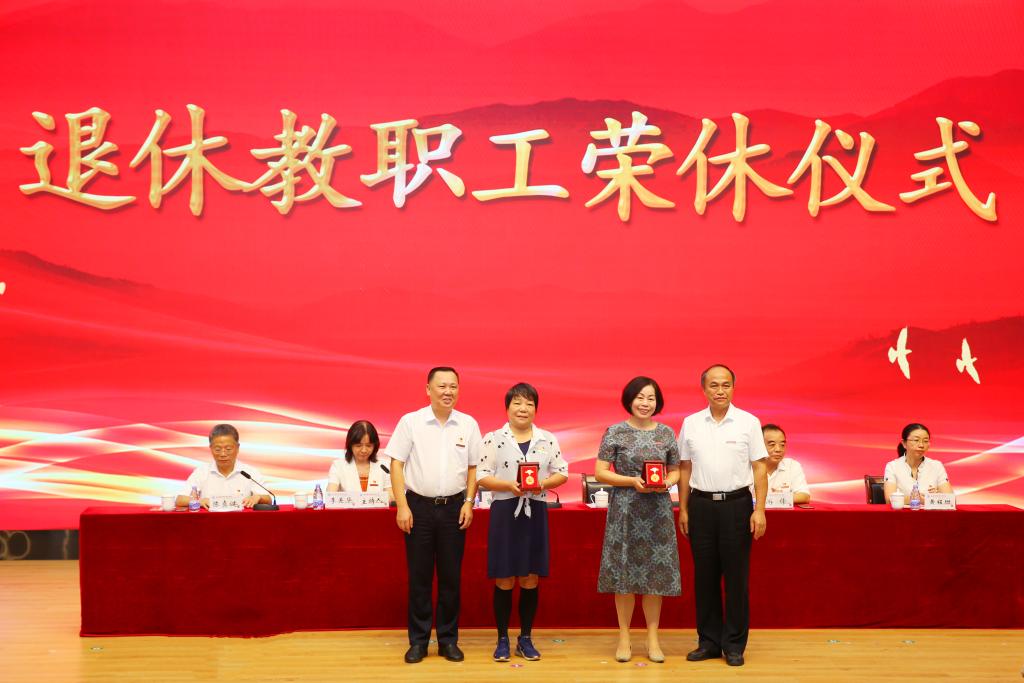 隨后進行了教職工榮休儀式,曾武祈、許能鋒為退休教職工代表鄭韻芳、蔡丹鳳2位老師頒發了“光榮退休紀念章”,代表學校向她們及全體離退休教職工致以衷心感謝和崇高敬意。