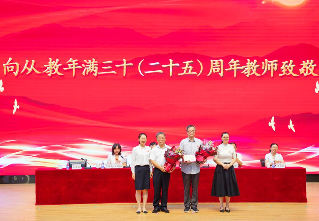 曾武祈和許能鋒還為獲得從教滿三十年周年的教師代表陳貞健、廖偉堅2位老師頒發證書,以掌聲和鮮花向所有在教育事業默默躬耕、無私奉獻的教師致敬。