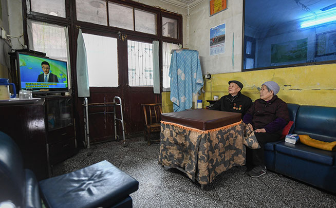 圖為張富清和老伴在住了幾十年的老房子里看電視。