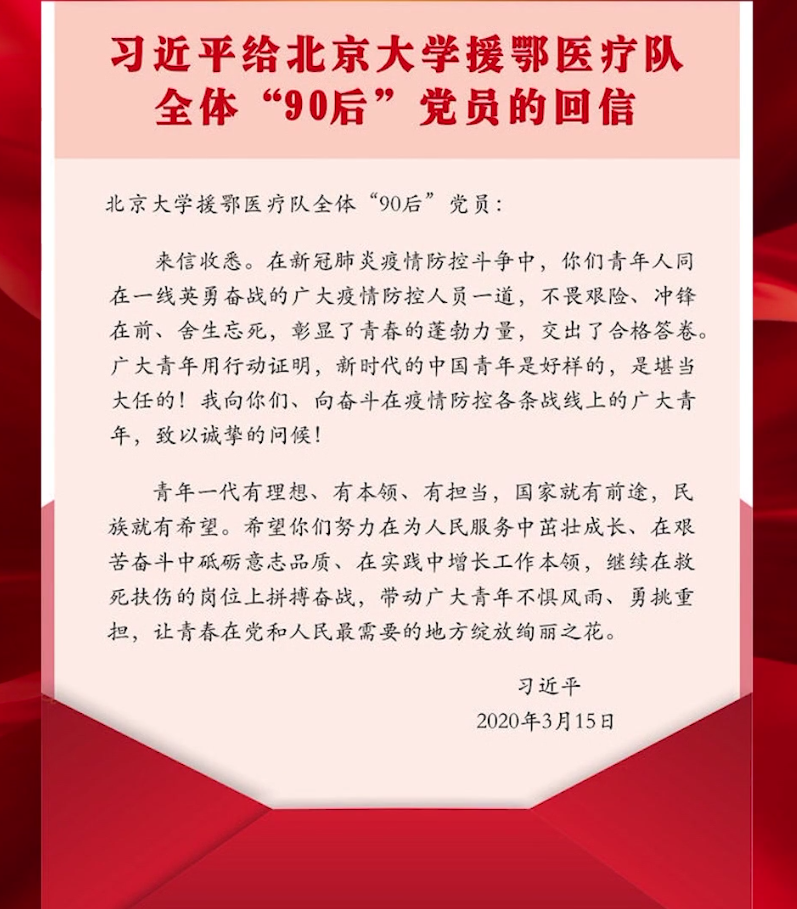 3月15日,習近平總書記給北京大學援鄂醫療隊全體“90后”黨員回信,向他們和奮斗在疫情防控各條戰線上的廣大青年致以誠摯的問候。總書記在回信中表示,在新冠肺炎疫情防控斗爭中,青年人同在一線英勇奮戰的廣大疫情防控人員一道,不畏艱險、沖鋒在前、舍生忘死,彰顯了青春的蓬勃力量,交出了合格答卷。廣大青年用行動證明,新時代的中國青年是好樣的,是堪當大任的!【回信全文】