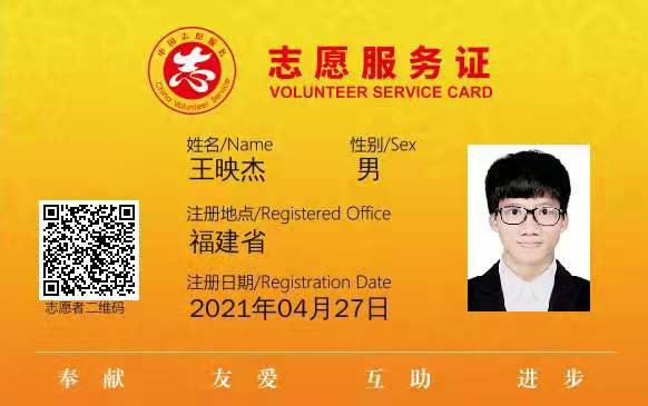 王映杰具有強烈的社會責任意識和奉獻意識,積極參與紅十字應急救援、人道救助、救護培訓活動,在社會實踐中提升自身志愿服務本領。2020年1月,他加入安溪縣紅十字會義工服務團,現任服務團文明宣導員。2020年10月,他加入學校紅十字會學生分會,積極參加各類志愿服務活動,配合開展急救技能培訓、考試。在 “無償血車進校”暨“三救三獻”、“九九公益日”等活動中,倡導無私奉獻、救死扶傷的崇高精神,宣傳紅十字人道公益項目品牌。在開學季,他積極投入校園防疫工作,參與新生體檢復檢工作及四輪全校全員核酸檢測,服務全校師生28000人次。