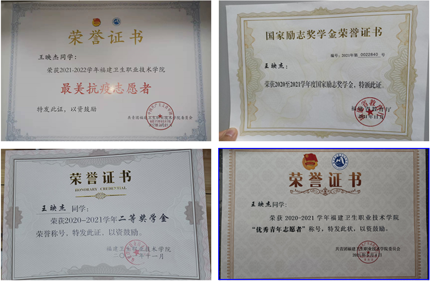 王映杰同學的學習成績也很優秀,曾獲2020—2021學年國家勵志獎學金、校級二等獎學金和校“優秀共青團員”稱號。