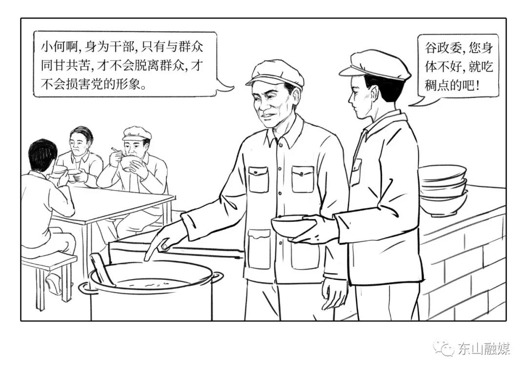 吃飯時,炊事員見谷書記那么消瘦,就特地給舀了一缽很稠的粥。谷文昌看看自己的碗,又看社員們喝的都是地瓜絲湯,二話不說就把自己手中的稠粥倒進大鍋里,說:“我怎么能搞特殊?”何坤祿流下眼淚說:“谷政委(谷文昌兼駐島部隊政委),您身體不好,就吃稠點的吧!”谷文昌生氣地瞪了何坤祿一眼,自己舀了跟社員一樣的稀粥吃了起來。